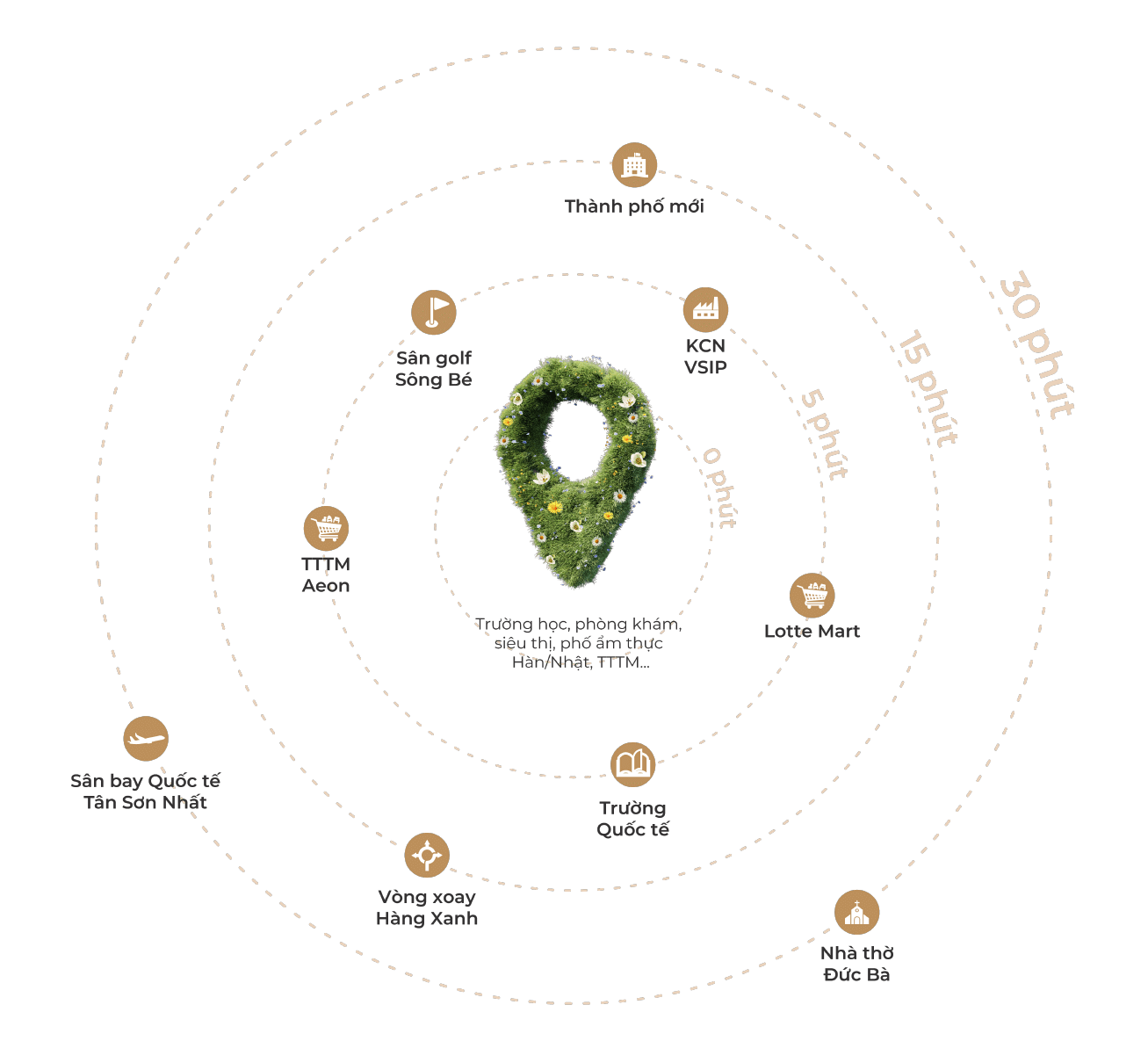 - Trong bán kính 5 phút: Aeon Mall, Lotte Mart, sân Golf Sông Bé, Bệnh viện Quốc tế Hạnh Phúc.